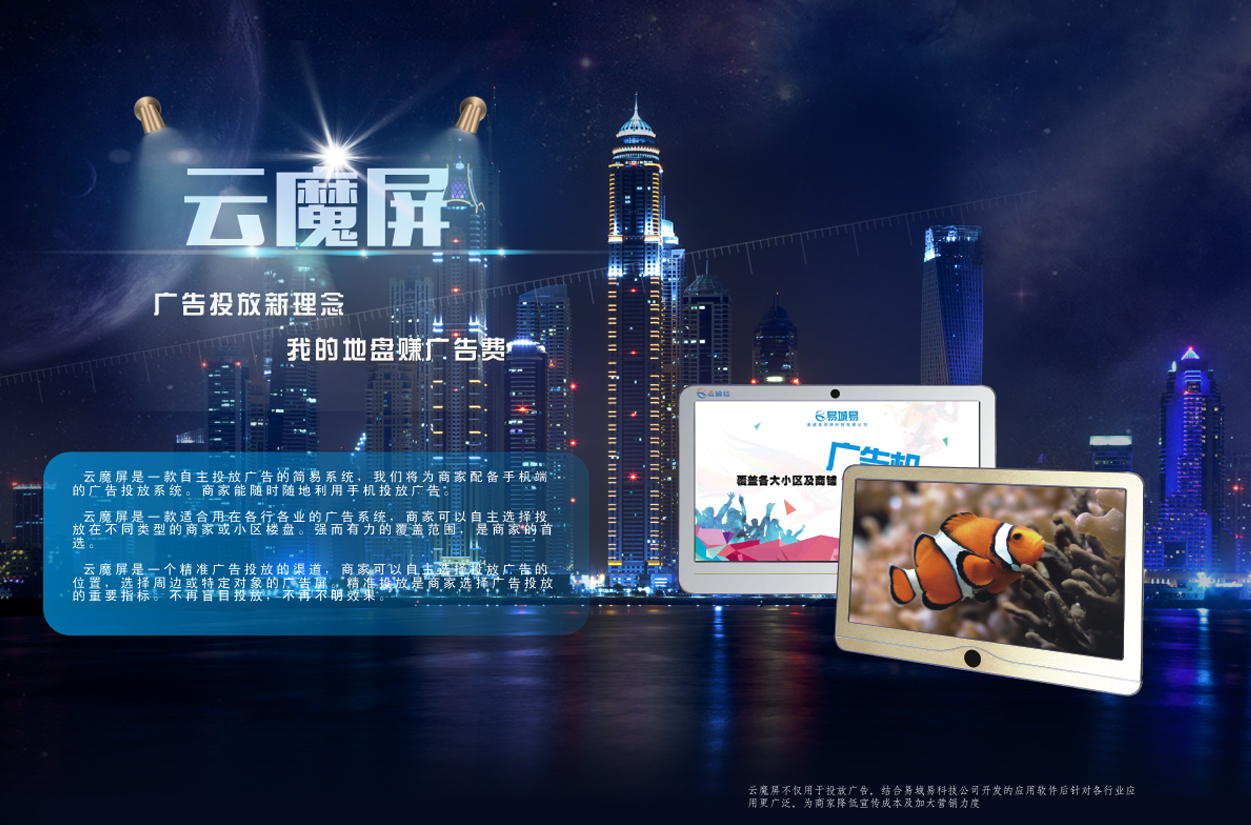 易城易云魔屏+是互聯(lián)網(wǎng)+傳媒+智能硬件與軟件的科技。專注打造“互動(dòng)媒體+廣告”的新媒體平臺(tái),以做為應(yīng)用場景,增加商家的宣傳價(jià)值、開創(chuàng)互聯(lián)網(wǎng)互動(dòng)媒體新局面。